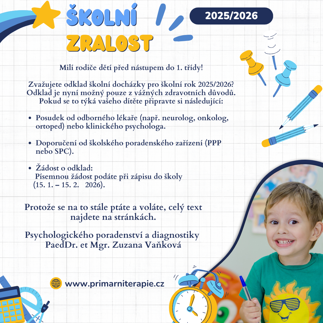 Pokud si nejste jistí jestli o odklad žádat nebo ne, a potřebujete kontrolní vyšetření školní zralosti (bez zprávy), určitě se na to společně můžeme podívat.